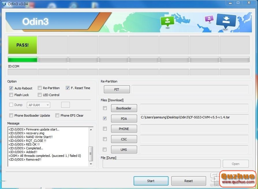 7.通過數據線連接www.shuleba.com電腦 如驅動被正確安裝 手機平台Odin3 v3.06左上方會顯示高亮的淡藍色並顯示如[0:com5]字樣 此時點擊右下方的 Start 按鈕開始刷入