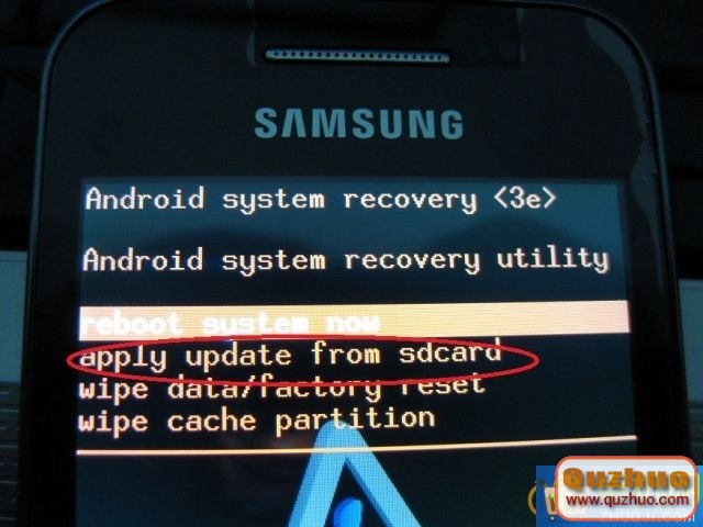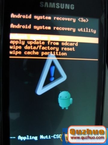 4、用音量鍵選擇:apply update from sdcard,按HOME鍵(功能鍵)進入SD卡目錄,選擇update.zip文件,再按HOME鍵盤確定更新,更新完成後重啟。