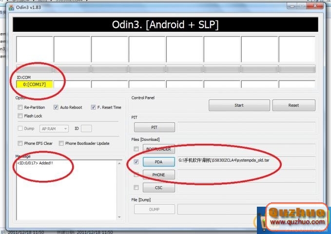 插上USB線,打開Odin3_v1.83.exe軟件,當看到第一格子有一個黃色的時候,說明USB線以及驅動正常可以刷機,點PDA按鈕 選擇.tar文件,再點Start開始刷機