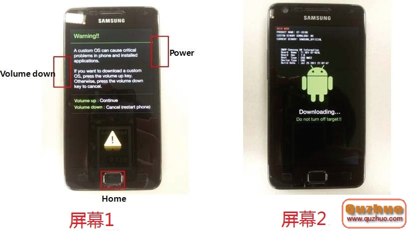 7.手機關機按住 音量下+HOME+POWER鍵進入如屏幕1界面 看到屏幕1後再按下音量上鍵 進入刷機模式 如屏幕2