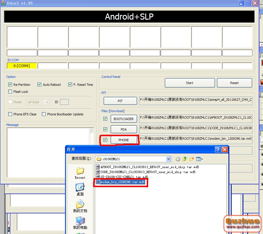 5.點擊“PHONE” 選擇 modem_bin_1208296.tar.md5文件