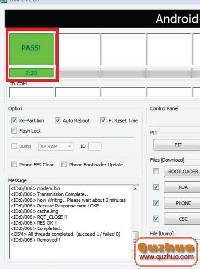 9.刷機完成後刷機平台的左上側會顯示綠色“PASS”。
