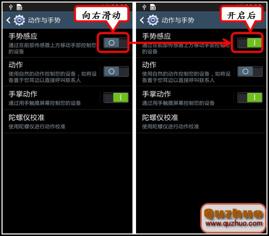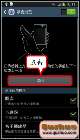三星手機Galaxy S4 GT-I9500/GT-I9508/SCH-I959/GT-I9502增加了非常神奇的手勢翻頁功能,這一功能又叫浮窗浏覽,具體是指:當您在浏覽圖片、網頁、聽音樂時,不需要用手指觸摸屏幕向左或者向右滑動,只需要在傳感器上方向左或向右移動您的手,即可前往上一項或者下一項。若要開啟此功能,請按照以下步驟操作: