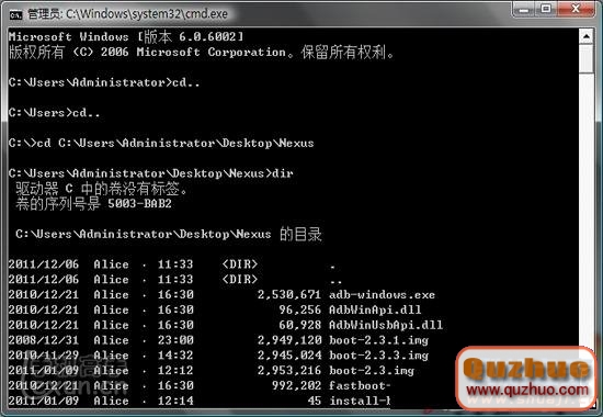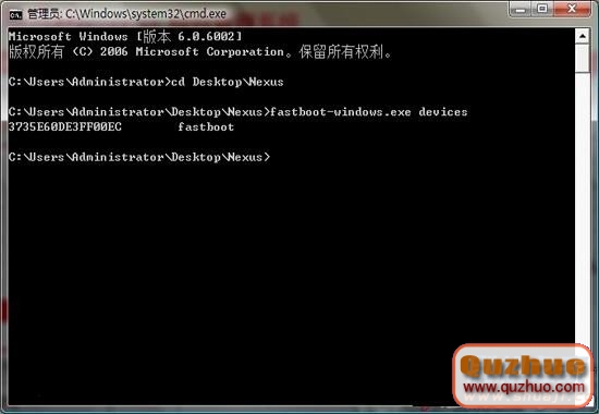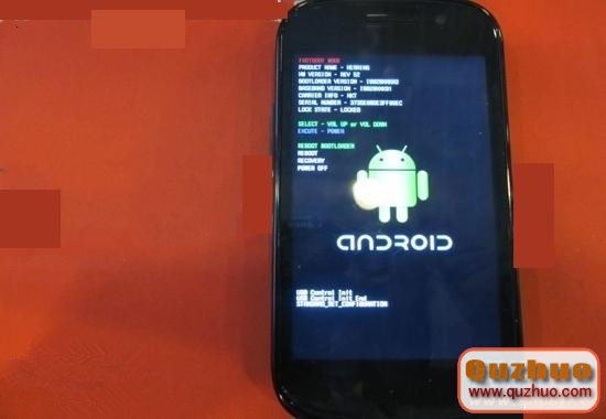 2、下載完成之後將壓縮包解壓到自己所熟悉的一個路徑的文件夾之中。(這裡以存放在桌面桌面的Nexus文件夾為例,即路徑為:C:UsersAdministratorDesktopNexus)然後將手機連接上www.shuleba.com電腦,這一步不需要關機。但是需要注意的是手機不要以大容量存儲模式來連接www.shuleba.com電腦。然後雙擊文件夾中的reboot-bootloader.bat ,手機會重啟進入BOOTLOADER。如下圖所示: