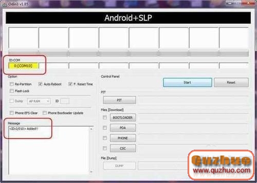 這時在www.shuleba.com電腦上打開Odin3 v1.85程序,如果程序的左下角Message顯示出下圖中那樣有“Added!”的字樣,並且ID:COM下面第一個方框內顯示顯示黃色底色提示表示端口已經連接的狀態,就是表示手機已經連接識別成功;