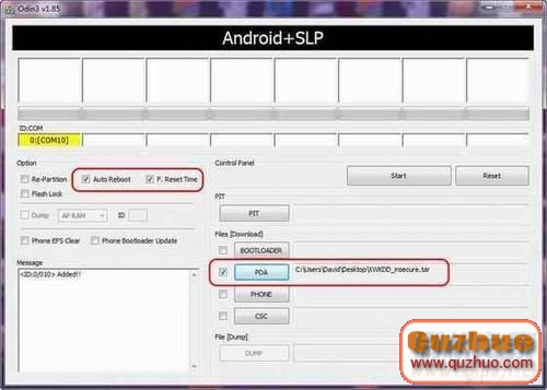 在PDA按鈕前打上勾,然後選擇XWKDD_insecure的壓縮包,並確保只是勾選了“Auto Reboot”、“F.Resrt Time”、“PDA”這三個選項;