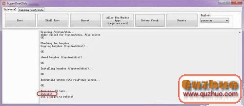 上面那些對話框全部按完之後,主界面會出現“Success”的字樣,這就是標明機器已經三星I9100 root成功了;