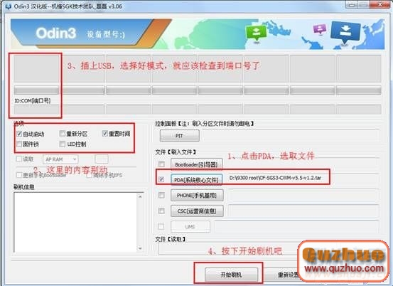 2、點擊Odin3內的PDA,把下載的CF-SGS3-CWM-v5.5-v1.2.tar選上