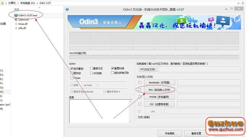A.解壓【三星刷機工具】Odin_3.07漢化版.zip到www.shuleba.com電腦上任意盤,雙擊Odin3 v3.07.exe,並點擊界面上的PDA,找到剛才下載的cwm6.0.1.4-root-i9300.tra