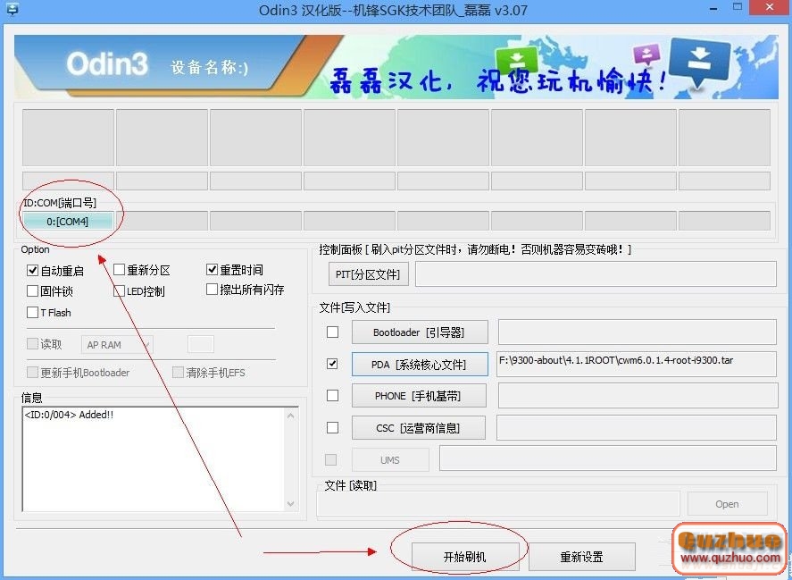 C.通過USB把手機連接上www.shuleba.com電腦,這時候刷機軟件Odin界面的左上角端口會變成淡藍色,證明已經連接上了,接著點開始刷機!很快就刷機完成了,會自動重啟!