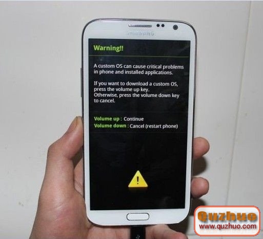 3、Note 2關機,然後同時按住“音量鍵下”和“電源鍵”和“Home鍵”不放,直到出現一個大的黃色三角(內有一個“!”),左上角第一行是“Warning!!”字樣的界面。