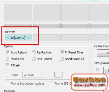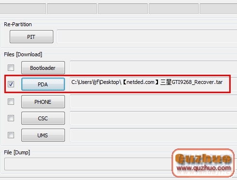 4:打開之後軟件會自動識別你的手機,識別成功後會在ID:COM處顯示藍色的(表示手機連接成功了,如果沒有顯示藍色的,說明沒有有連接好),然後勾選PDA,選擇剛才下載下來的【三星GTI9268_Recover.tar】包。