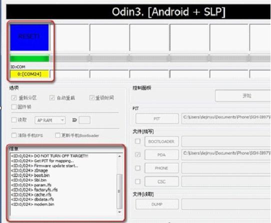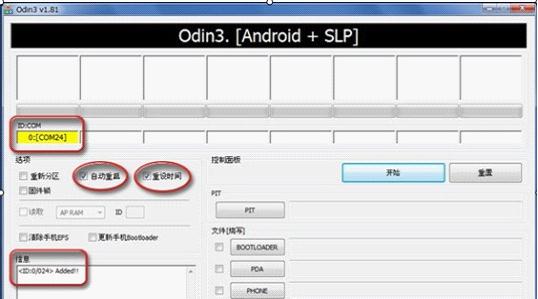 打開Odin3刷機程序後,你會看到下列刷機界面(Odin3 V1.81)。從第一到第三排,都有8個格子,可以同時刷8台機子。你通常只會用的左邊第一列而已,因為你只刷一台手機。進入挖煤狀態和數據線連好後,“端口”區ID:COM背景變為黃色,裡面的數字是串行口號碼。“自動重啟”和“重設時間”被默認勾上。在“信息”窗口,會顯示Added!!這些表示一切正常。
