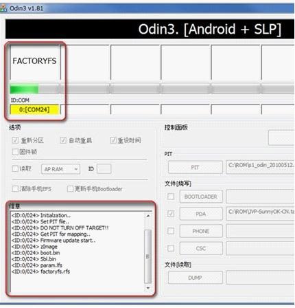 按PIT按鈕,輸入PIT文件:s1_odin_20100512.pit(根據下載的rom包文件)