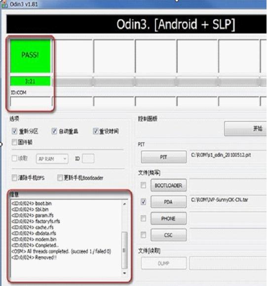 左上角的格子變成綠色背底,裡面的字是PASS,表示刷機通過。