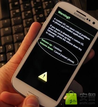 如上圖,進入到三星i9300刷機模式後,我們可以看到手機中出現了不少英文提示,其大意為:第三方操作系統可能會導致手機和已經安裝的程序發生嚴重性錯誤,如果要繼續,請按音量向上鍵,否則請按音量下鍵取消。