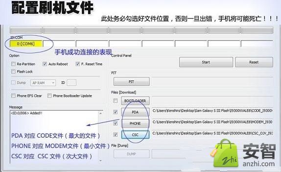 我們按按音量向上鍵繼續吼,之後會提示相關系統信息,左上角提示設備信息和系統信息狀態,下面大的圖標為安卓系統圖標,這就是進入到三星i9300的刷機模式,此時就可以連接www.shuleba.com電腦進行刷機的下一步操作了。 在進行下一步之前,首選我們需要在www.shuleba.com電腦中下載三星i9300的ROM程序(附近提供)。需要特別注意的是刷機提醒務必正確勾選好文件,否則一旦出錯,手機極有可能損壞,導致無法挽回,如下圖: