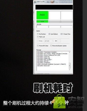 整個刷機過程一般也不長,差不多4-5分鐘即可完成刷機,當三星i9300屏幕上的進度條走完後,說明刷機接近尾聲,之後軟件狀態欄會出現PASS,同時手機會自動重啟。