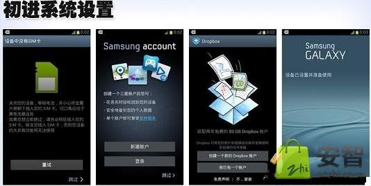 進入初始系統後,之後將是一些基本設置,其中包括三星account賬號設置以及還有可以獲取兩年免費的50G Dropbox賬戶,雖說在國內實用性並不大,但的確也頗為厚道。