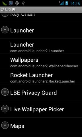 首先安裝一個Launch Pro(Lp),在Widgets裡會多出一個“活動列表”,把它添加到桌面,並設置為Launcher--Rocket Launcher就可以了(見下圖)。