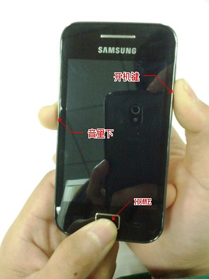 在關機情況下,依次長按”HOME”+”音量下”+”開機鍵” ,出現黃色Downloading…字樣放開按鍵,此時已進入刷機模式。