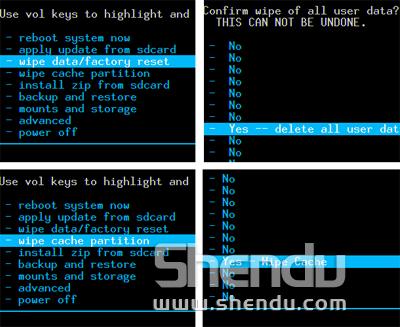按音量鍵上下移動光標至“wipe data/factory reset”,按Home鍵確認進入,繼續選擇“Yes—delete all user”開始清除Data分區。