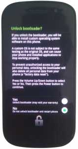 5、手機會出現如左圖所示的解鎖提示界面,按音量鍵選擇YES, 再按電源鍵確定。bootloader已經解鎖,你會看到如右圖所示的解鎖後的bootloader界面,保持在解鎖後的bootloader界面。