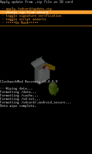 1、進入Recovery,將MIUI完整ROM包安裝至手機。選擇"install zip from sdcard"並確認,選擇"choose zip from sdcard"並確認。