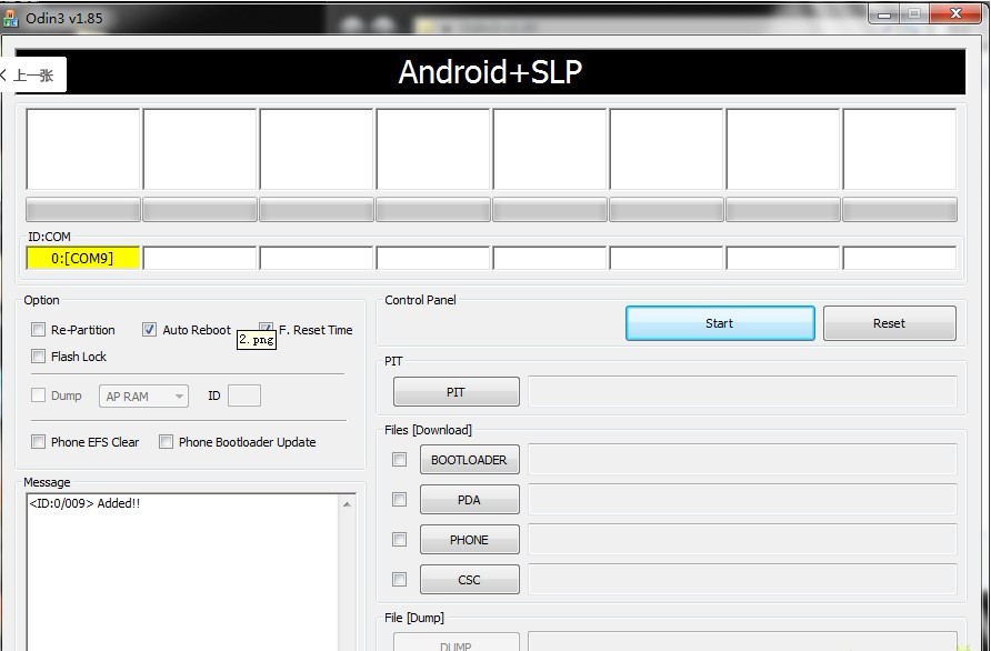 5、點擊PDA按鈕,並選擇剛才下載的recovery-clockwork-4.0.1.4-galaxys2.tar的位置,這時候確保只有3個位置是打開勾,如上圖所示.然後就可以點擊Start,等程序把這個內核包刷入手機後,手機會自動重啟。(出現下圖界面表示已成功)