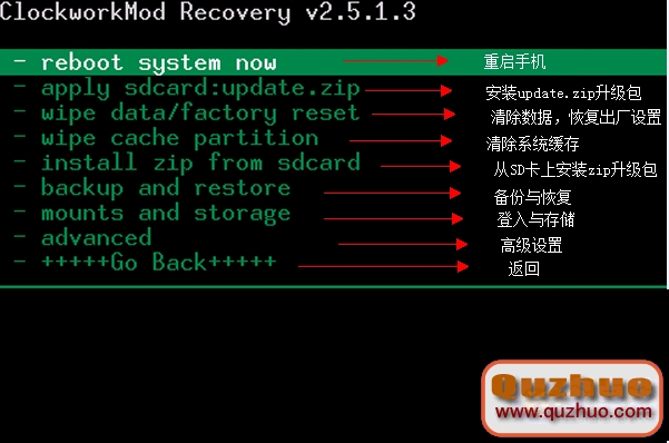 【Recovery的進入方式】 1:完全關機,按住音量上下+電源鍵開機 【功能詳解與圖例】 音量鍵為光標選擇鍵,可以用來移動光標,電源鍵為確認鍵!用miui的還可以用4大