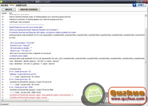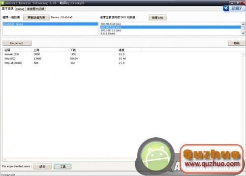 4.手機通過USB連接電腦,電腦運行那個機器人,同時手機運行剛才安裝的軟件(只是運行,不做任何動作)。點擊更新設備列表,如果連接成功的話,就如圖,設備列表是一串數字,DNS伺服器下面是IP地址,然後電腦再點擊Disconnect,這時會跳轉一系列的英文。