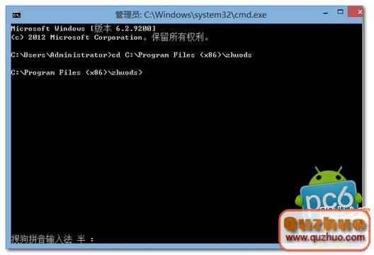 接著在指令提示符窗口中輸入指令“cd C:\Program Files (x86)\zhuods”(以你上面仿制的途徑為准,不一定和我的相同,不必一個字一個字的輸,只需輸入cd+空格,再右鍵單擊粘貼方才仿制的途徑即可),回車顯現如圖,就將工作途徑切換到卓大師刷機專家的裝置文件夾了。