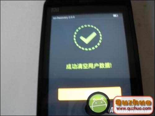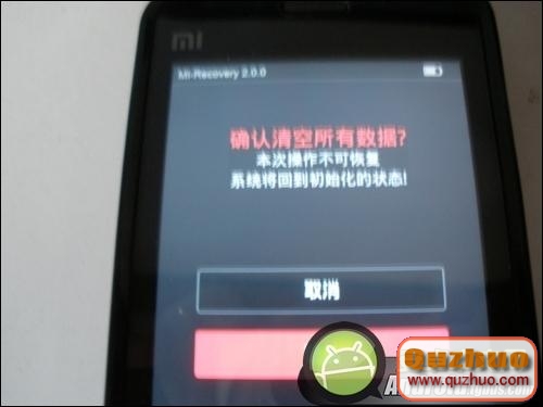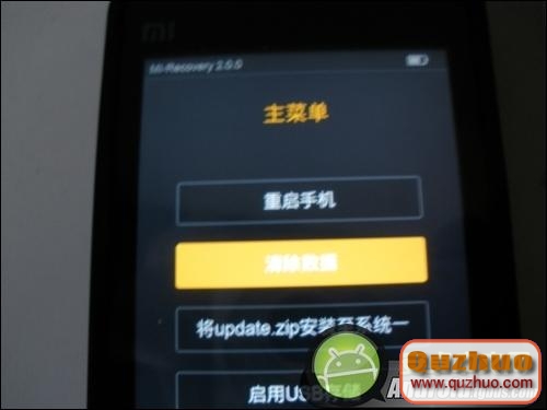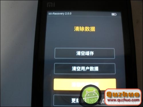 3.手機進入Recovery 後,清除數據 ->清除所有數據 【重要提示,手機己經更新過了分區並且是MIUI V4,所以下面的步驟沒有更新分區,如果沒更新過的朋友們請不要隨便嘗試!】
