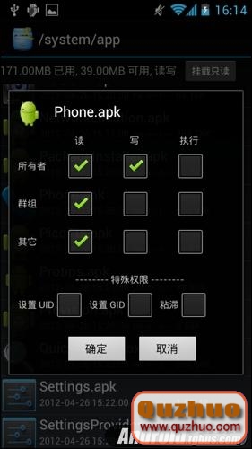 用rootexplorer打開/system長按Phone.apk出現菜單選權限,修改Phone.apk權限如下(如果提示說只讀點擊rootexplorer右上角的“掛載讀寫”)