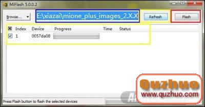 點擊黃色圈選部分Refresh,刷機程序會自動識別手機,點擊紅色圈選部分Flash開始刷機。