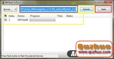 點擊黃色圈選部分Refresh,刷機程序會自動識別手機,點擊紅色圈選部分Flash開始刷機。