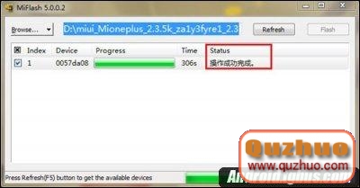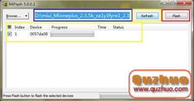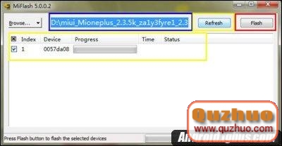 點擊黃色圈選部分Refresh,刷機程序會自動識別手機,點擊紅色圈選部分Flash開始刷機。