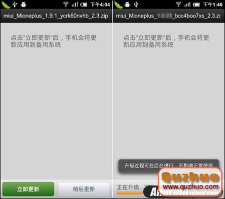 Recovery下更新zip包 注意:將下載好的zip文件重命名為upadate.zip放置SD卡根目錄下。 小米手機MIUI V4 ROM 2.5.4下載