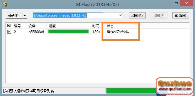 4、刷機工具(MiFlash20130911.exe)下載完成後解壓並安裝(如遇到系統安全提示請選擇允許安裝),打開MiFlash.exe將復制的內容粘貼到藍色區域位置。點擊黃色圈選部分刷新,刷機程序會自動識別手機,點擊紅色圈選部分刷機開始刷機