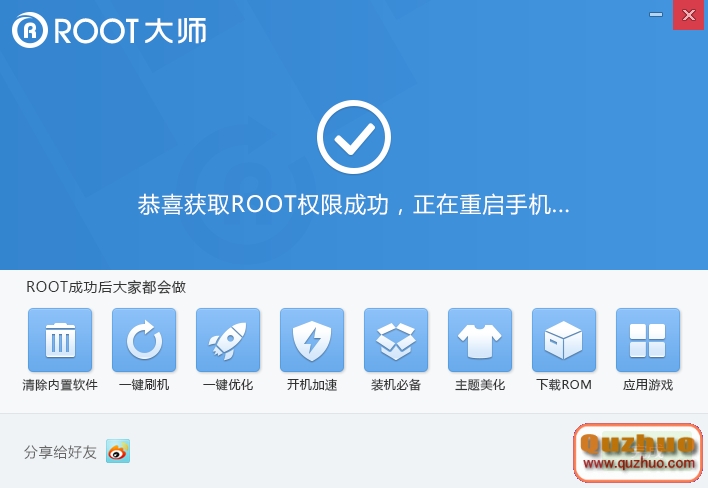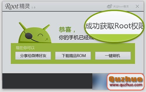 4)耐性的等候一下,直到提示ROOT成功,就代表你的手機現已取得ROOT權限了。(如下圖所示)