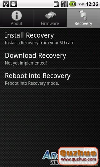 沒有特別情況的話,上步完成之後就已經為手機輸入recovery了。然後就可以點擊Reboot into Recovery來進入recovery界面了。(關機後按home(房子建)+音量上+電源鍵也可以)
