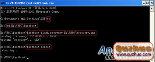 fastboot flash recovery E:\V880\recovery.img(輸入recovery,注意替換路徑)