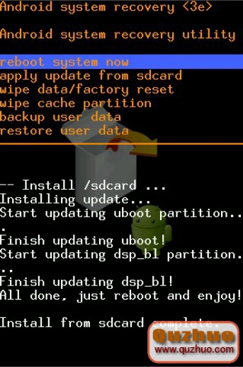 4、等待軟件自動升級完成後返回到Recovery主界面,選擇【reboot system now】,手機自動重啟。