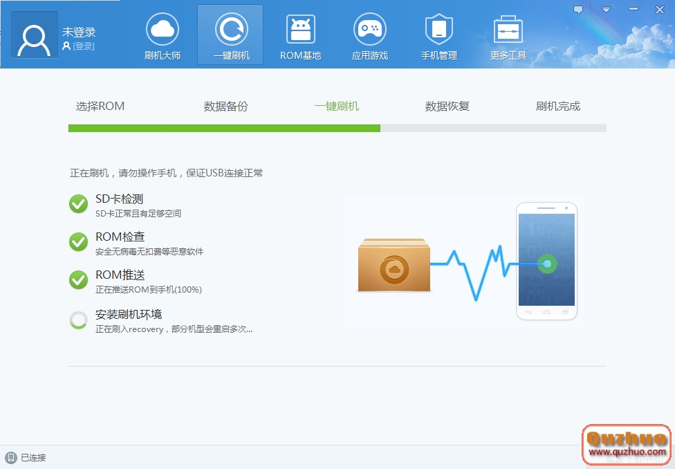 一般使用一鍵刷機軟件都需要獲取root權限,軟件首先推送第三方Recovery,然後推送第三方刷機包,再重啟刷入第三方Recovery,然後再自動雙清、刷機升級,完成後自動開機!