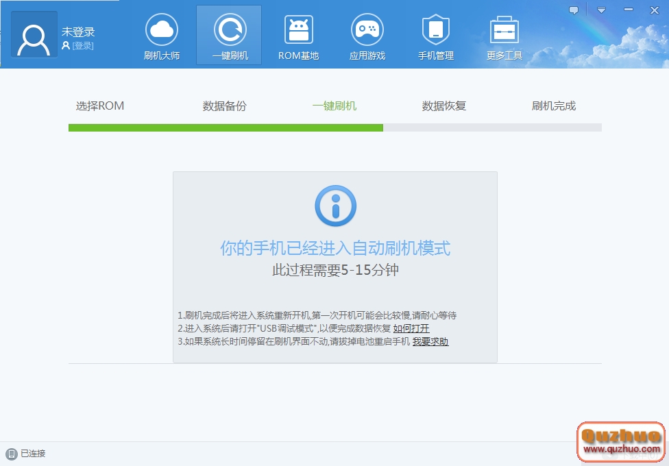 1、如果沒有獲取ROOT權限可以使用刷機大師的ROOT大師來獲取權限,然後手機打開USB調試,通過數據線連接電腦,打開刷機大師,確認連接成功。