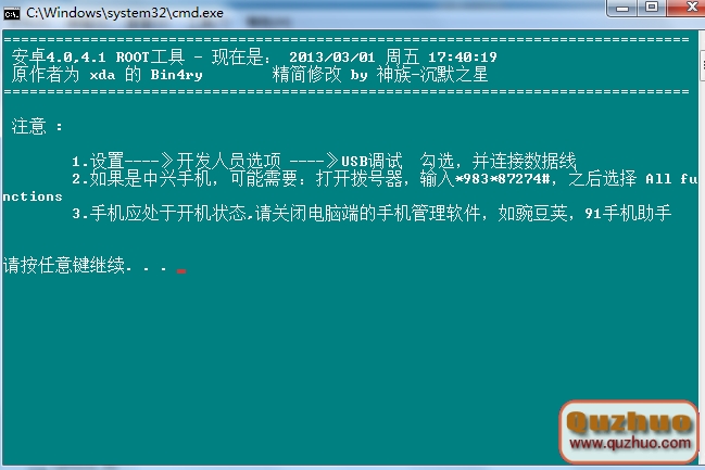 4:如果手機連接好線一切都正常的話,那運行root軟件後,按照軟件上的提示,按任意鍵即可,接著手機上顯示如下圖: