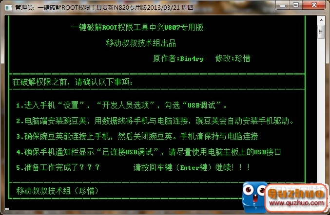 6、運行剛才解壓出來的“一鍵破解ROOT工具中興U807專用版”文件夾中的“一鍵破解ROOT工具中興U807專用版”,並按照裡面的提示操作