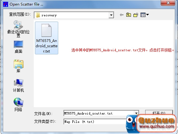 Step 6. 選中Recovery目錄中的MT6577_Android_scatter_emmc.txt文件,點擊“打開”按鈕;