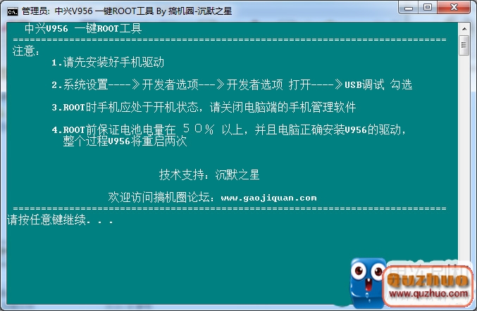 下載文件,雙擊其中的exe文件運行,按任意鍵繼續,等待即可,手機將重啟兩次