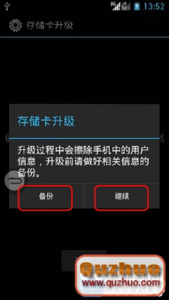 5、界面上會出現備份提示,根據自己需求,如果需要備份就點擊“備份”按照提示操作,如果不需備份,直接升級就點擊“繼續”。